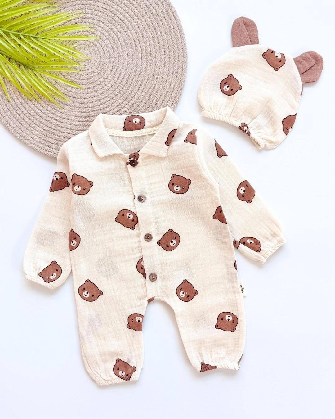 Ayıcık Baskılı Şapkalı Müslin Bebek Tulumumuz Şapkası İle Beraber 2 Parça Halinde Gönderilecektir.